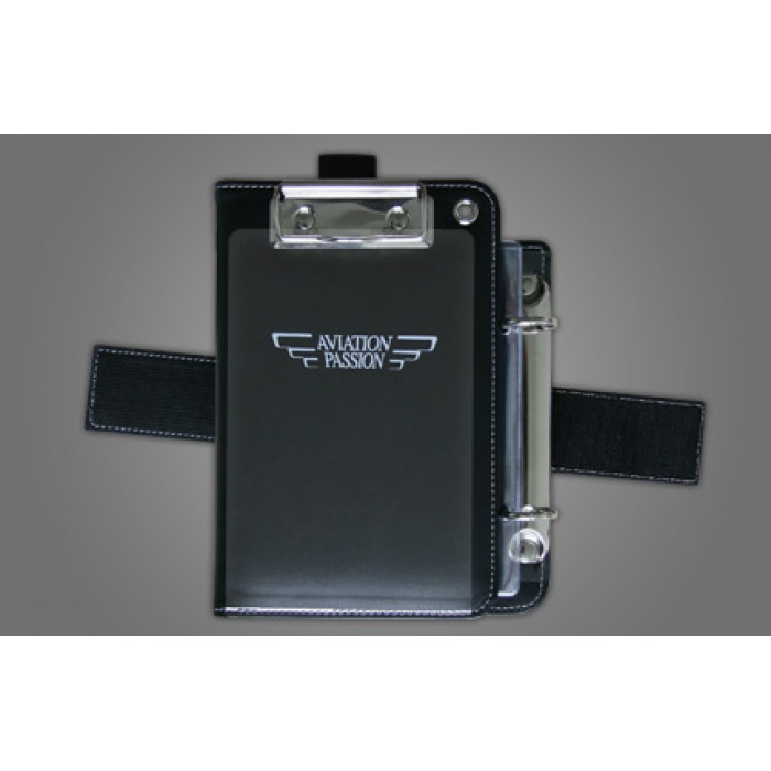 In zwart synthetisch leer, voorzien van een metalen clip aan de bovenkant om documenten te bevestigen (notities, kaarten, navigatie-log, ...) maximale afmetingen van 10 x 16 cm en heeft twee pen houders, een doorzichtige plastic bescherming aan de voorzijde en een elastische band met klittenband om op uw bovenbeen te kunnen bevestigen.